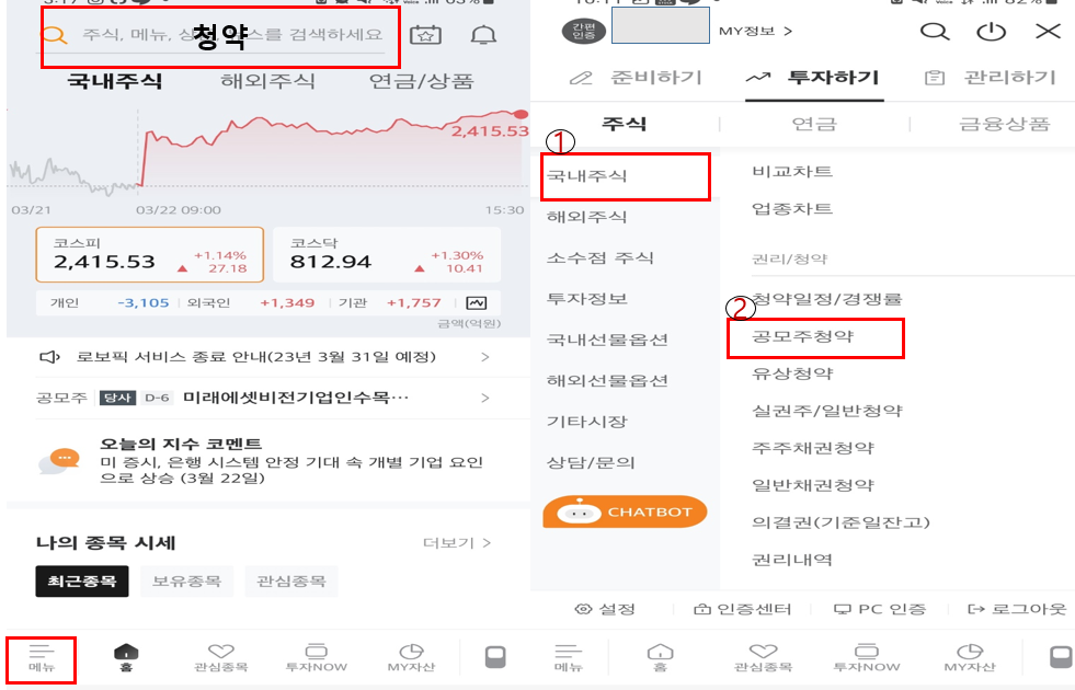 1. 미래에셋증권 어플 M-TOCK에 접속 -> 메뉴 -> 주식 탭 -> 국내주식 -> 공모주 청약
