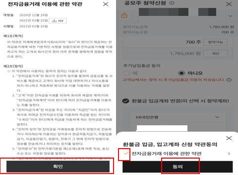 환불받을 계좌 입력까지 마치면 전자금융거래 이용에 관한 약관을 확인합니다. 확인 후 동의를 누릅니다.