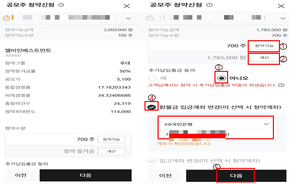 4. 공모주 청약 가능 수량 입력 및 환불금 입금계좌 확인