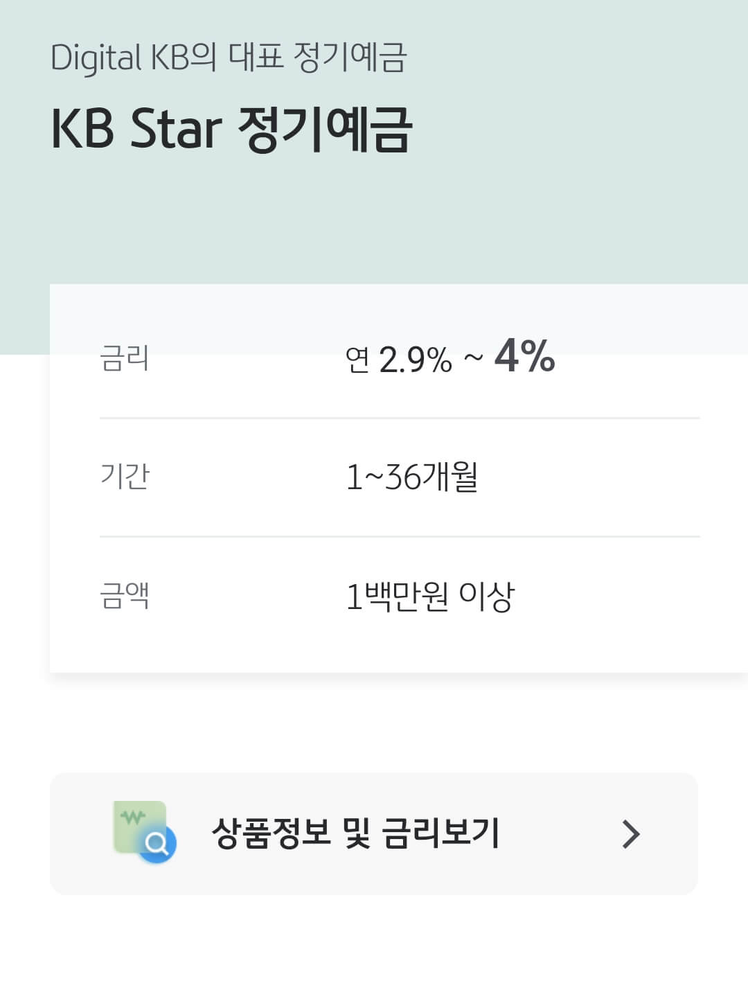 국민은행 KB Star 정기예금은 연 최고 4% (6개월 이상 12개월 미만 시)의 금리를 제공합니다.