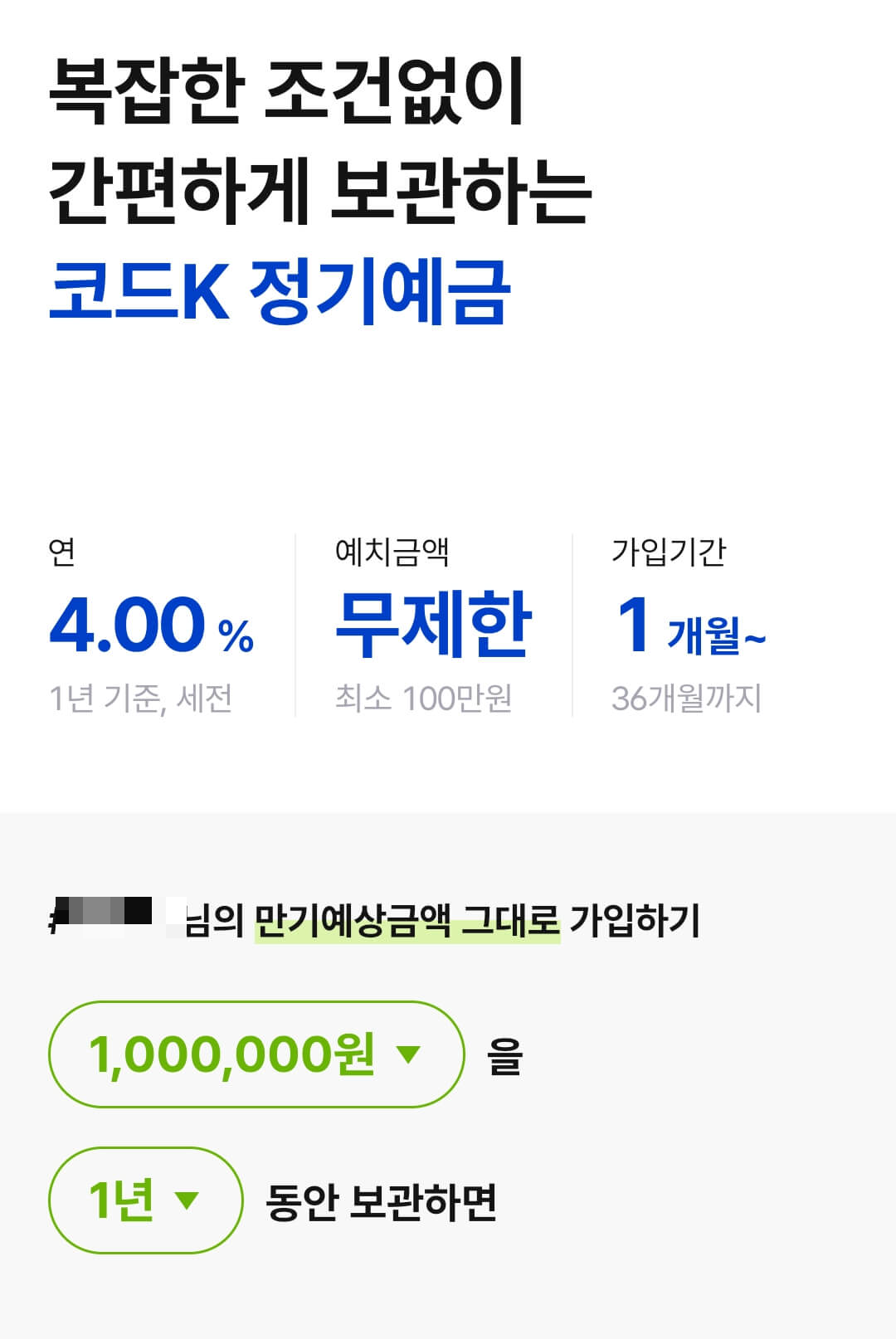 케이뱅크는 제가 주로 사용하는 인터넷 은행인데, 파킹통장, 생활통장 등 다양한 상품이 있고 어플을 이용해 사용하기가 편리해 자주 이용합니다. 케이뱅크의 코드K 정기예금은 최고 연 4%의 이자를 제공하고, 예치금액은 최소 100만원부터 무제한으로 예치할 수 있습니다.