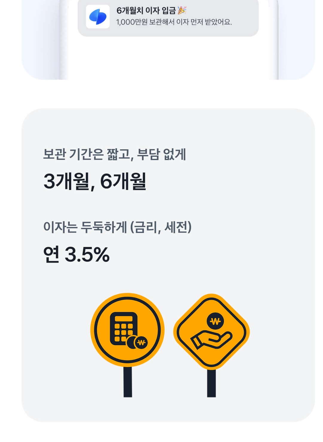 토스뱅크에서는 돈을 예치하면 이자를 먼저 받을 수 있는 정기 예금 상품이 있습니다. 연 최고 3.5%의 금리를 제공하는 상품입니다. 가입기간은 3개월 또는 6개월 단위로만 가입이 가능합니다.