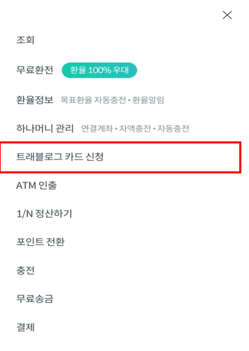 2. 실행 후 메인화면에 더보기를 클릭 후 '트래블로그 카드 신청'을 선택합니다.